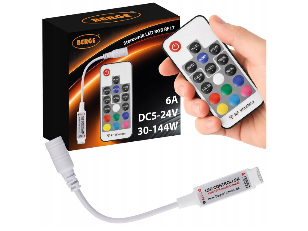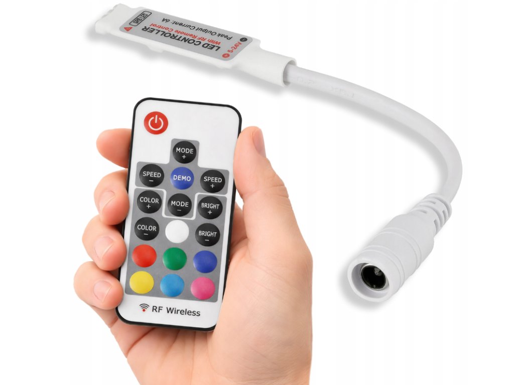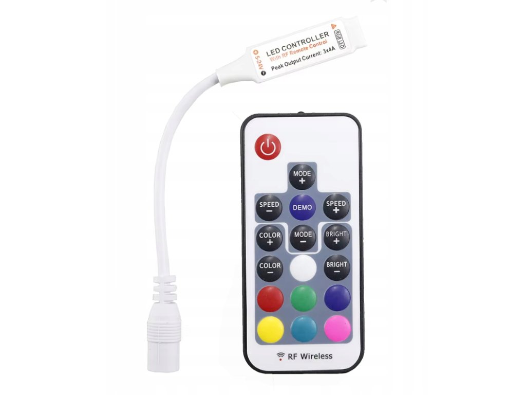 ⚙️ Dane techniczneTyp: sterownik / kontroler LED RGB Model: RF17 Sterowanie: RF – pilot radiowy Liczba przycisków pilota: 17 Napięcie zasilania: DC 5–24V Maksymalny prąd wyjściowy: 6A Maksymalna moc: 72W (12V) 144W (24V) Obsługiwane źródła światła: taśmy LED RGB (3-kanałowe) Zasięg pilota: do 20 m Stopień szczelności: IP20 |