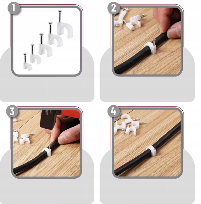 Držáky kabelů pro kabelové girlandy s hřebíky 4 mm, 100 kusů, bílé, vnější průměr 4 mm