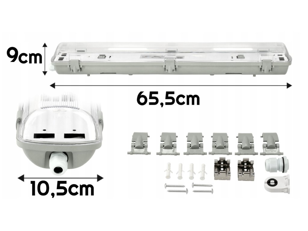 Technické údaje:Materiál:PVC, ABS Verze:Hermetické vázání plechem Vyměnitelný zdroj světla:ano, 2x60 G13 T8 LED Třída těsnosti:IP65 Montážní sada:kolíky, tlumivka, 2x destička, klipy Napájení:jednostranný Certifikáty:CE, RoHS | |