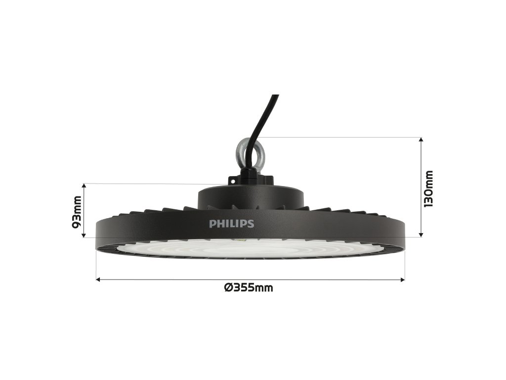 ✅ Technické údaje:Výkon:185 W Světelný tok:28 000 lm Účinnost:150 lm/W Barva světla:4000 tisíc CRI:80 Úhel světelného paprsku:116° Napájecí napětí:220–240 V Frekvence:50–60 Hz Třída ochrany:A Stupeň těsnosti:IP65 Mechanická odolnost:IK06 Materiál těla:hliníkové odlitky Materiál stínidla a optiky:polykarbonát Celkový průměr:355 mm Celková výška:93 mm Váhy:2,7 kg Instalace:zavěšené, možnost použití háčků nebo konzol Vestavěný ovladačZdroj |