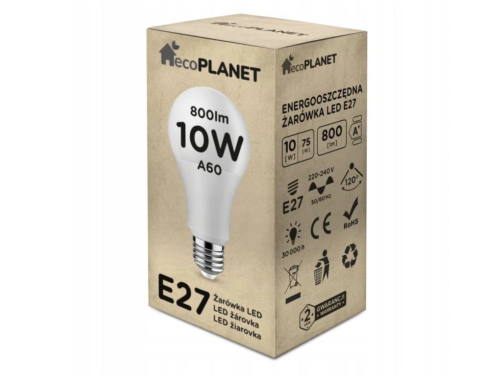 Specifikace žárovky: Model:E27 10W kulatá žárovka A60 ecoPLANETNapájecí napětí:230 V AC 50–60 HzTyp SMD diody:2835Světelný tok:800 lumenůIndex podání barev CRI:Ra 80Rozměry:délka 110 mm / šířka 60 mmRozměry:ŽÁDNÝPočet cyklů zapnutí/vypnutí:15 000násobekŽivotnost:30 000 hodinÚhel světelného paprsku:220°Výstupní výkon:10 W (ekvivalent světelného zdroje 50 W)Materiál:plastové pouzdro, uvnitř hliníkový chladičCertifikáty:CE, RoHS