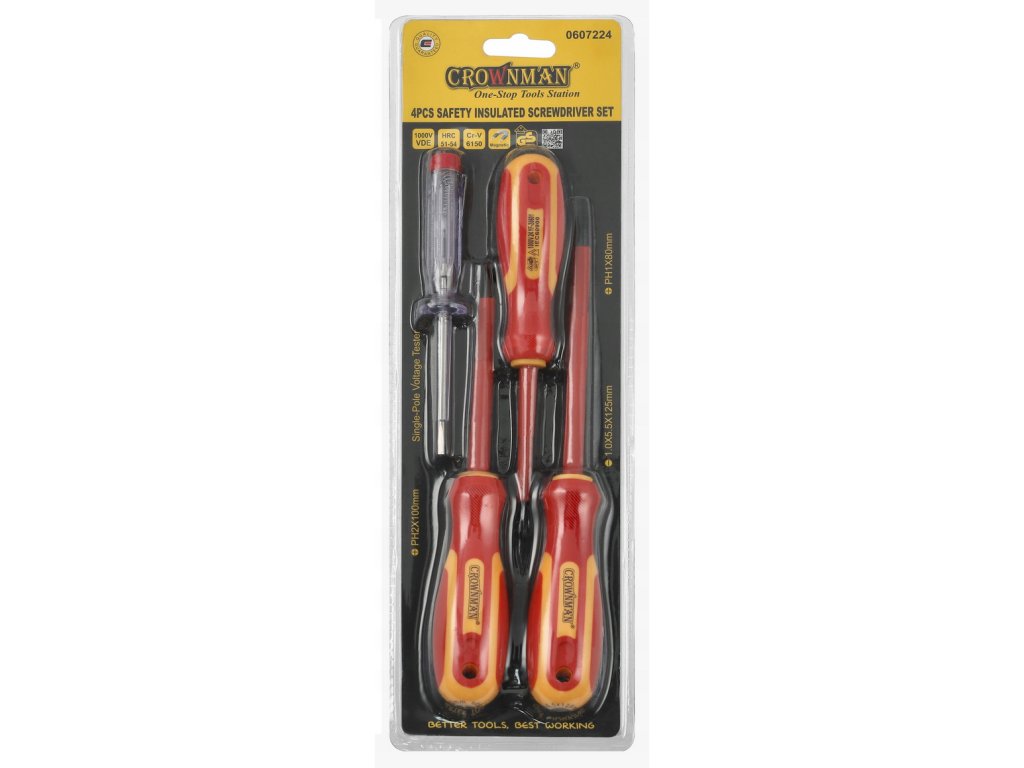 Crownman – sada čtyř izolovaných šroubováků 1000 V s magnetickými hroty a zkoušečkou napětí. Profesionální nářadí, které kombinuje bezpečnost, odolnost a pohodlí.