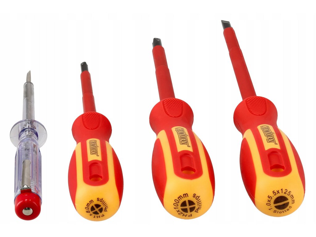 ✅ Kompletní sada 4 v 1 – 2× křížový, 1× plochý, 1× zkoušečka napětí.