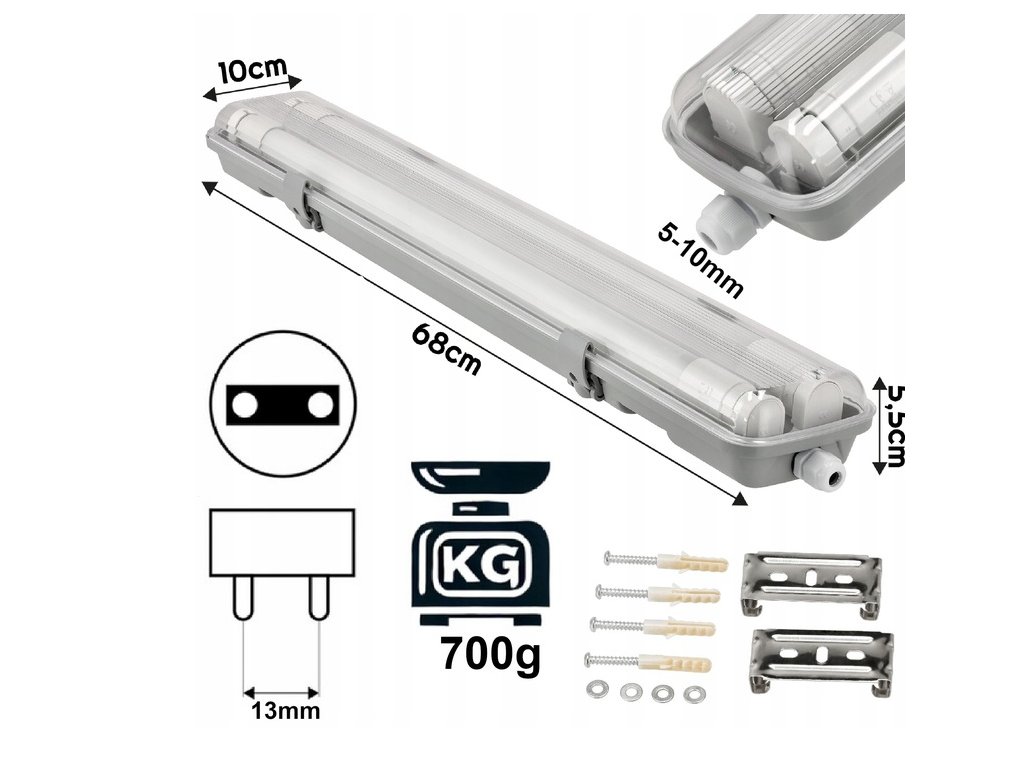 Technické údaje:Velikost:délka 67 cm / výška 7 cm / šířka 10,5 Montáž zářivky:G13 T8 120 cm Počet míst pro zářivku ve svítidle:2 Materiál pouzdra:ABS Materiál stínidla:PS Třída těsnosti:IP65 Napětí: 220–240 V Montážní sada:kolíky, šrouby, průchodka, 2x destička, spony Velikost kabelu:5–10 mm | |