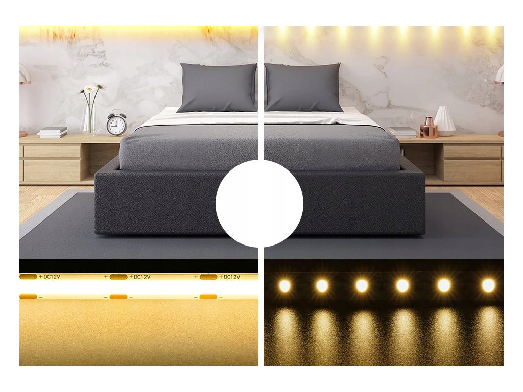 ✔️ Proč je COB lepší?COB páska používá velmi hustě rozmístěné diody umístěné pod jednotnou vrstvou fosforu, díky čemužcelý pásek se rovnoměrně rozsvítíV praxi to znamenáestetičtější osvětlení, žádný bodový efekt a mnohem lepší vzhled ve srovnání s klasickými SMD páskami. | |